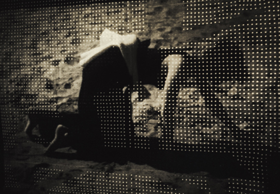 Splitting is a 9-part suite for dancer based upon the theory that every living cell contains within itself the entirety or the One. Part 9 (notation) positions Part 4 (dialect) behind a shadow screen in which hundreds of holes have been punched in a grid pattern to apply strobe effects to the movement.