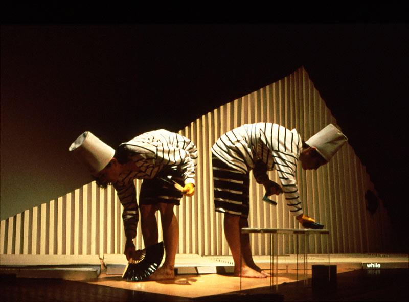 Experiments with floating heads on a pilgrammage to Mt. Fuji, a swimmer in a mylar pool, and calligraphy exercises for the hands create confusion between two- and three-dimensional space. Clusters of words move like the corps de ballet across the corrugated terrain of Mt. Fuji. A dancer spells out words with the hand alphabet at lightening speed. Above her head the light spells out ABRACADABRA in a spastic rhythm matching that of her hand. Dance proceeds on the horizontal planes, the dancers suspended one moment in space, another, in water. A teapot above pours words, not liquid, along an arc that defies the gravity of the situation. The logic of space and language is turned on its head.