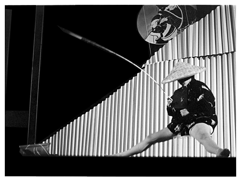Experiments with floating heads on a pilgrammage to Mt. Fuji, a swimmer in a mylar pool, and calligraphy exercises for the hands create confusion between two- and three-dimensional space. Clusters of words move like the corps de ballet across the corrugated terrain of Mt. Fuji. A dancer spells out words with the hand alphabet at lightening speed. Above her head the light spells out ABRACADABRA in a spastic rhythm matching that of her hand. Dance proceeds on the horizontal planes, the dancers suspended one moment in space, another, in water. A teapot above pours words, not liquid, along an arc that defies the gravity of the situation. The logic of space and language is turned on its head.