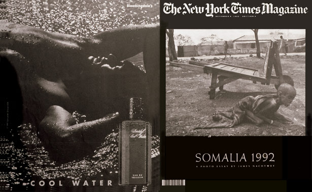 The antithetical covers of the Sunday New York Times Magazine, were not accidentally conjoined. They were created by a designer as a single board or digital file, and printed to spread across a single piece of paper. The front cover purports to bring us startling news and images of the dire consequences of the prolonged drought in Somalia: a malnourished, tense and suffering child faces the parched earth, his back protected from an unrelenting sun. The ominous wheelbarrow can be seen either as devoid of produce from the fields or goods that might relieve the child's suffering, suggesting that there is no hope, or it could be interpreted as transport that will take the child to his grave. The horror conveyed by the photograph is heightened by the appearance of individuals in the background who appear to be going on their way, oblivious to the child's urgent needs. The back cover, a perfume ad for Bloomingdale’s, cruelly flips the message of a child’s suffering with the alluring promise of living well and enjoying a paradise on earth. A robust, healthy man is relaxed and idle because he is nurtured rather than harmed by the elements, his face to the sun, his back immersed in the deep pleasure of shallow waters that promise to be cool (not cold) and sweet smelling. How many of the over 1.5 million Sunday Magazines ended up casually mislaid with their two covers spread out to reveal the embedded relationship of capitalist journalism to the human condition?