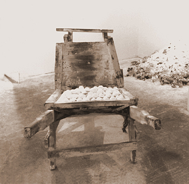 The installation prolongs association of the two diametrically opposed 'realities' represented in the front and back covers by replicating two of the physical objects in the photographs and commenting on the opposite forces which unite them: wet/dry, supine/prone, pleasure/pain, domestic/foreign, etc. Our tasks were not unlike those of the graphic artist who orginally prepared these photographs side by side for the printer. The installation shows media is no longer the message but the frame, the filter, the screen, the peephole, the window, the lens by which we interpret the world.