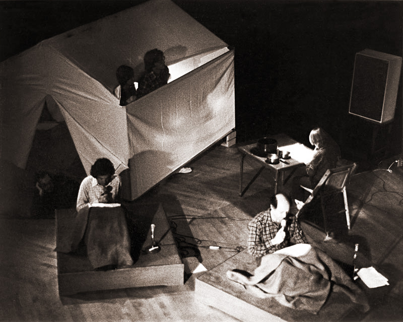 The essence of the work lies in the unassuming intimacy developed among the players. Musicians are encamped on two levels to give the uncontained sense of an outdoor scene without the use of a backdrop or other props. The percussionists are housed within a white tent on the second level. A ten year old boy writing at a desk is seen on the second level. Instrumentalists lie on their sides under blankets, their knees folded into their chests. The oboist lies atop the violist, each on their side, as though the vertical side-stacking of bodies were an ordinary sleeping arrangement. The bassoon hangs horizontally above the head of the bassoonist. A male vocal quartet recites text sound poetry. At one point the somnolent mood is broken by loud percussive intrusions that cause the tent to billow and flap. The cellist mouths the silent scream of a bad dream, curls up and appears to sleep once more. The boy at the desk leaves his chair and softly strikes three Buddhist temple bowls with a small mallet.