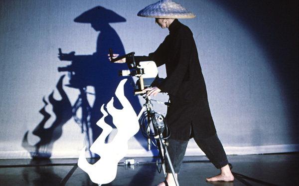 Antebellum Bedlam takes a tongue-in-cheek look at the General in the debriefing room during the conflict building up to the Korean War. He must cope with a possible world cataclysm while surrounded by the giddiness of the American-Japanese peace. At the center of activity is the hull of an American battleship off the coast of Japan. On the foredeck and bridge, a Multi-Image “Orchestra” of multiple projectors bombard the performance space with cartoon animations and irreverent goings-on to depict a Japan that prefers American prosperity to the return to war culture. Meanwhile, the debriefing of war prisoners in the War Room leads MacArthur toward a strategy to conquer Chinese troops in North Korea, and possibly China itself. Technical gizmos include a fleet of puppet ships sailing through air and a motorized rowboat taking a terrorist to the ship’s prow.Antebellum Bedlam was commissioned by Kala Institute for their Seeing Time Festival of Performance Art, and was staged in their atelier studios in Berkeley. This performance featured the first appearance of Doug Baird’s Multi-Image Orchestra--in the 1980s, slide projectors were the high tech solution for the projected image. MAFISHCO purchased all manner of antique projectors from the flea markets which the technical crew fitted out with rotation tables, rotating discs, cones, film strips and color wheels.