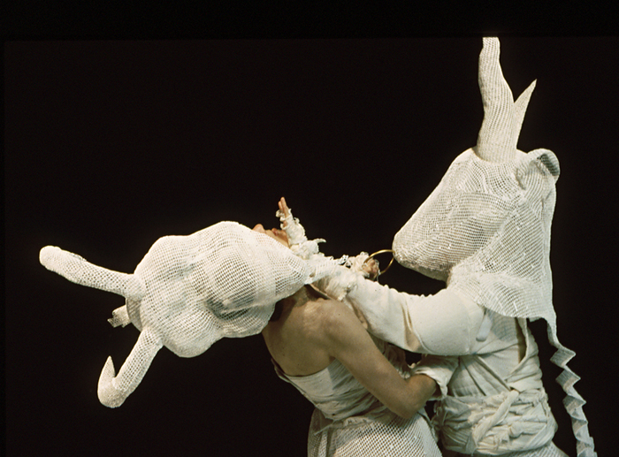 Two site-specific installations resulted from the elaborate designs of Vice Versa, The Reliquary for the River Styx with its Giotto-inspired elegants sets, and The Reliquary for the River Marsyas, with chaotic mountain of straw and fog, tagged walls and rope deity.